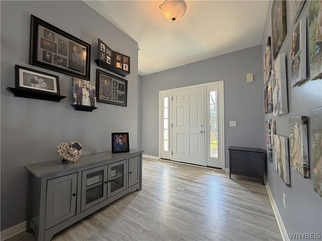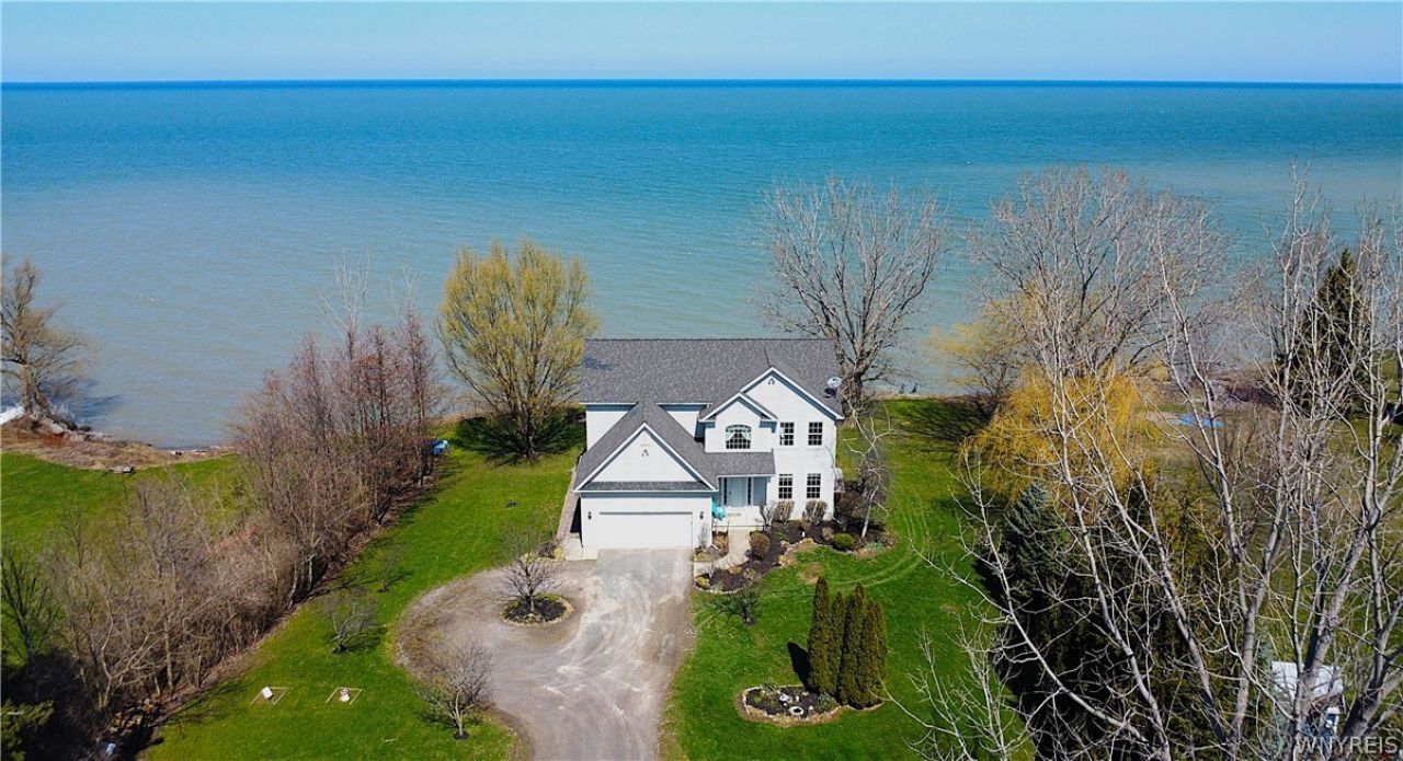 Stunning Lakefront Colonial - Modern Comfort Meets Waterfront Living! Welcome to this spacious 4-bdrm modern Colonial w/2,500 sqft of beautifully designed living space on picturesque 1.3-acre lot w/128 feet of stabilized shoreline along Lake Ontario. Enjoy private lake access via year-round wooden stairs directly from your lakeside observation deck - perfect for embracing true waterfront living. Built in 2006, this well-maintained single-family home combines timeless style with modern convenience. Inviting floor plan features a cozy two-sided gas fireplace that adds warmth and character to multiple living areas. Synthetic hardwood flooring throughout provides durability and character. The heart of the home features soaring 9-foot main floor ceilings that create a bright, airy atmosphere. Dramatic wall of lakeside windows with transoms, along with upper and lower window box-outs and stairwell palladium window, frame spectacular water views and fill the home with natural light. A sleek, roomy breakfast island along with plenty of cupboard space inside of maple cabinetry top of the kitchen in spectacular fashion. The home also includes generously sized bedrooms and 2.5 baths, all with tiled floors, offering plenty of space for family and guests. Unfinished basement w/8-foot ceilings offers excellent potential for future living space - ready for your personal touch. The luxurious master suite is complete with: Jacuzzi soaking tub, Walk-in shower, Dual his-and-her sinks, Spacious walk-in closet, Elegant tray ceiling, Generous bedroom layout. Additional highlights include: Attached 2-car garage with high ceiling and extra storage space, Unfinished bonus rm above garage - ideal for home office/media room, Mature landscaping - easy to maintain, Extra-wide driveway w/ample parking &easy 2-way passage, Vinyl exterior. 30-year architectural roof. Large (10' X 20') sided shed for extra outside storage. With expansive living areas, breathtaking waterfront views, and a peaceful, natural setting, this exceptional lakefront property offers the perfect blend of comfort, space, and functionality - an ideal place to call home! Offers to be reviewed on Thursday May 7th at 5PM.